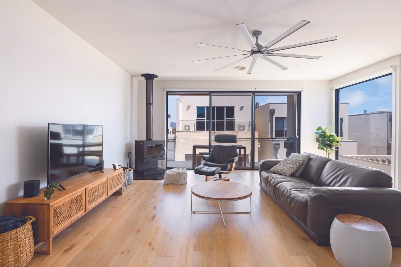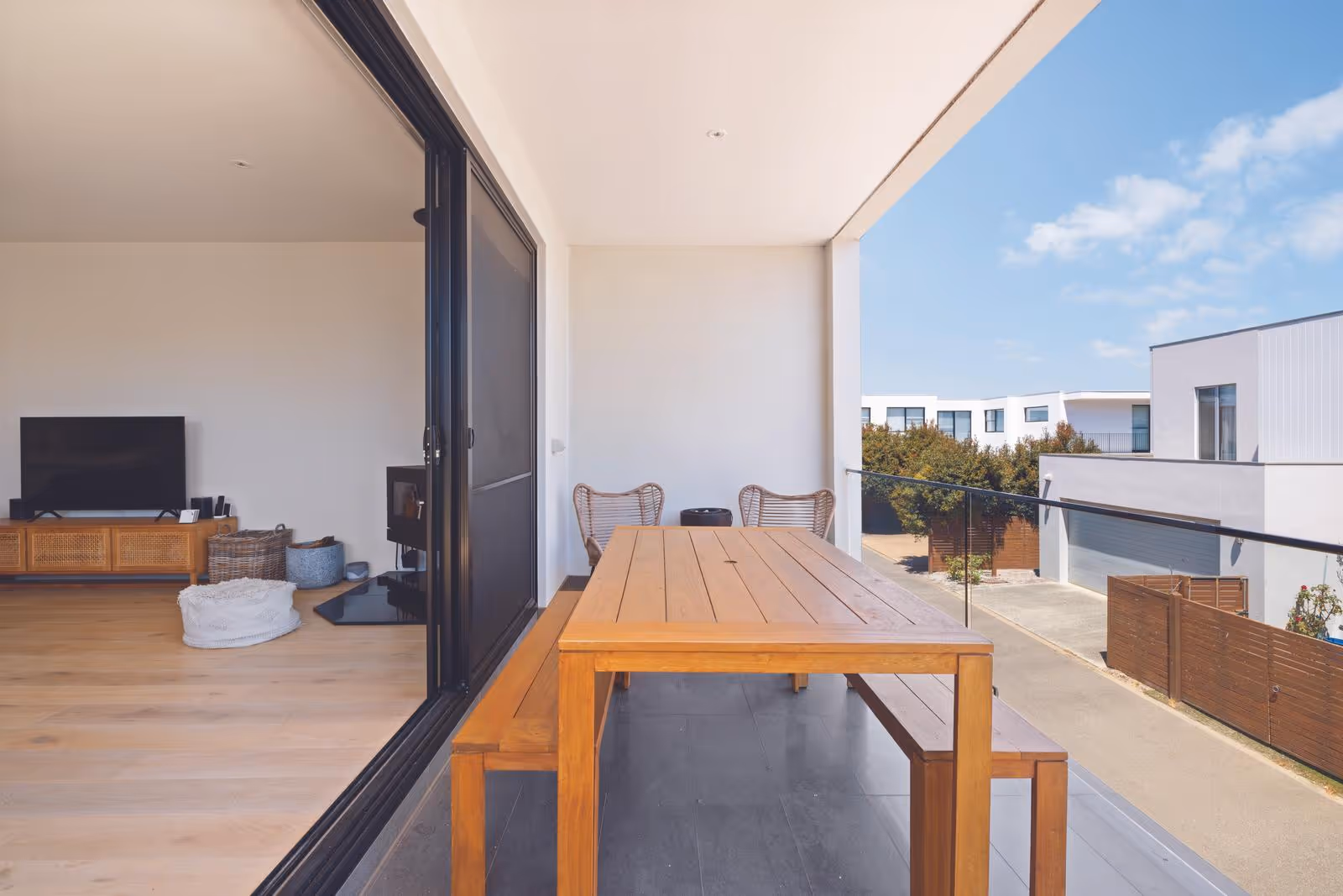 Finished with a freestanding Smeg cooker, Bosch dishwasher, and stone benchtops, the kitchen overlooks an open living and dining space where a south-facing balcony and the comforting crackle of a solid wood heater balance seasonal needs. Three bedrooms, three bathrooms, including an ensuite, spill below a top-floor master suite, featuring a dual vanity ensuite with walk-in shower, and walk-in robe. Supported by a two-zoned Fujitsu ducted heating and cooling system, oversized ceiling fan, engineered timber floors, a solid timber staircase, alarm system, elevated ceilings throughout, solar power, and a double garage with access from Deck Lane.