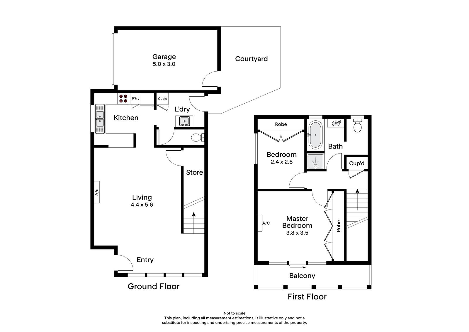 A main bathroom with built-in tub, shower, and private toilet, serves both first-floor bedrooms, while twin split-system heating and cooling units, dual roller blinds, generous internal storage, a laundry with secondary toilet access, and secure garaging for one or more vehicles, provides a comprehensive features list.