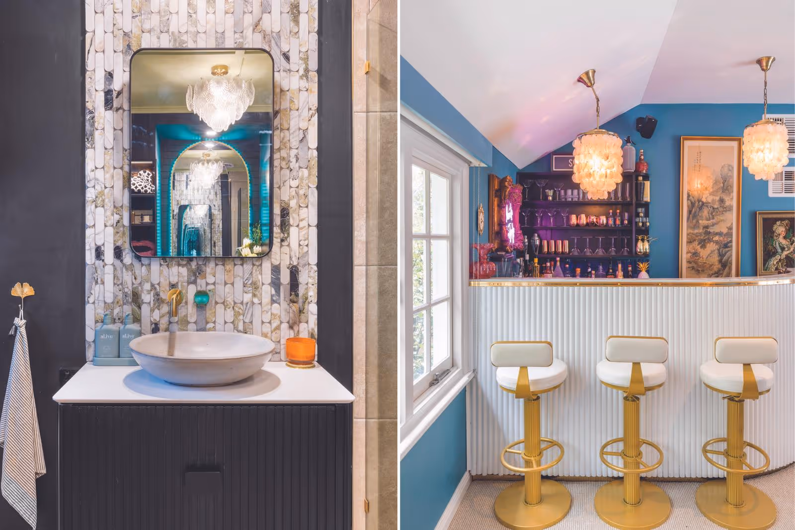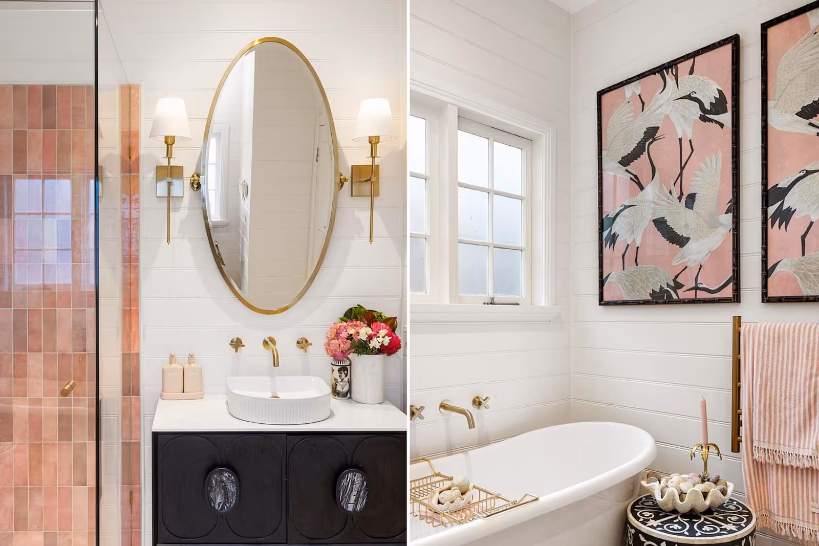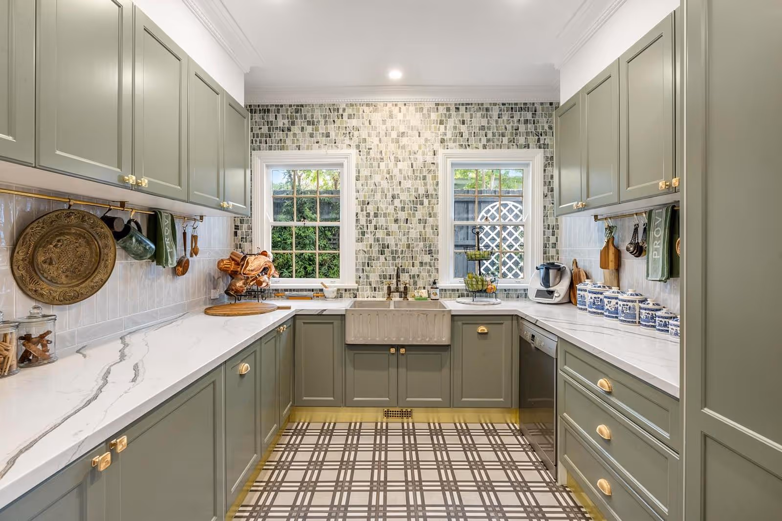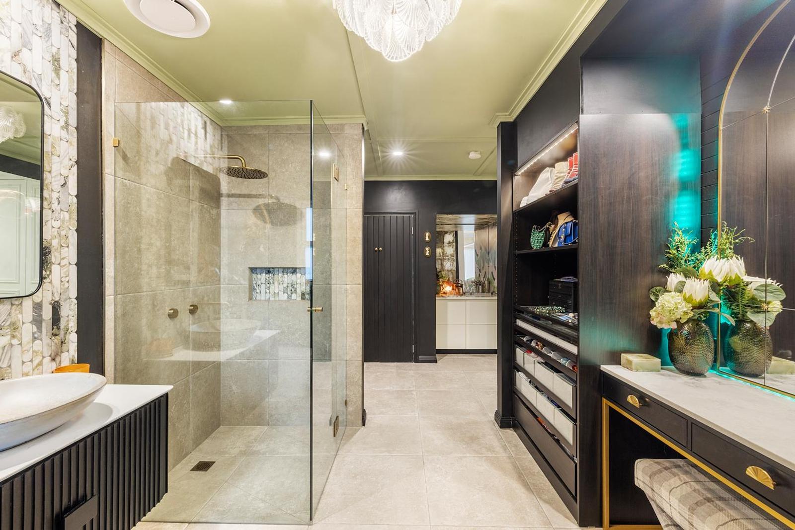 Designed with vibrant spirit and designer finishes, the exquisite interior by Plantation Collective showcases a stunning blend of global treasures. Soaring ceilings, panelled walls, luxurious materials, exquisite stone, tactile wall finishes and unique brass fittings; are showcased throughout the three distinct entertaining domains, including a formal living room with bay window seat, a first-floor lounge with bar and a central family domain. The kitchen with ice jade marble counter is accompanied by a generous butlers pantry/laundry room, outfitted with Ming green marble, stone benchtops, concrete sink and Nicolazzi Italian tapware.
