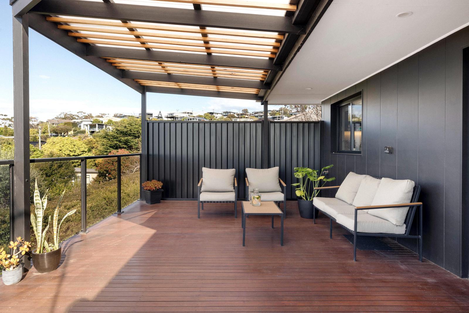 Step outside to the alfresco deck and soak in the panoramic outlook, ideal for morning coffee, sunset barbeques, or simply unwinding while gazing across the bay. Landscaped, low-maintenance gardens surround the property, complemented by an impressive edible garden featuring avocado, lemon, grapefruit, plum, nectarine, fig and olive trees, a veggie patch and a 5000L water tank.